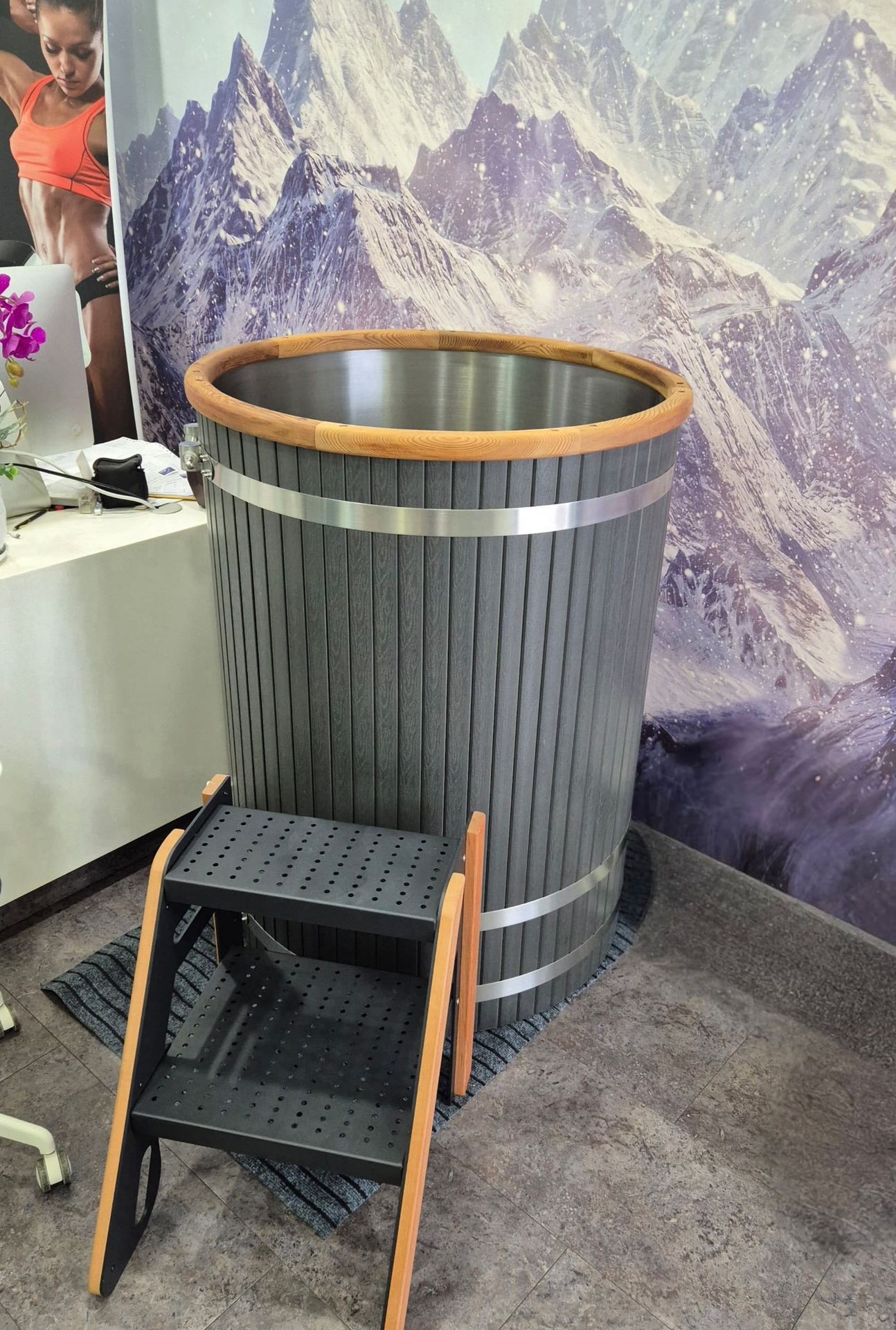 Beautiful vertical Cryo Plunge. ● Size 900x1000 ● Luxury insulated ● Stainless steel ● Easy to drain water ● New Elite chiller 1HP (1C/55C) to cool faster with 70% energy saving ● Able to adjust ozone disinfection volume. Advanced filtration.